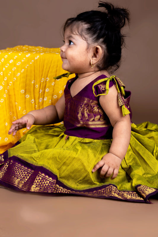 Green and Wine Kids Langa Blouse – Traditional Zari Border Cotton Dress for Baby Girl