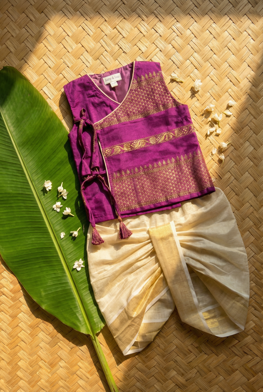 Royal Wine Angrakha Kurta with Reshme Beige Gold dhoti - Cotton Silk Ethnic Wear for baby boy