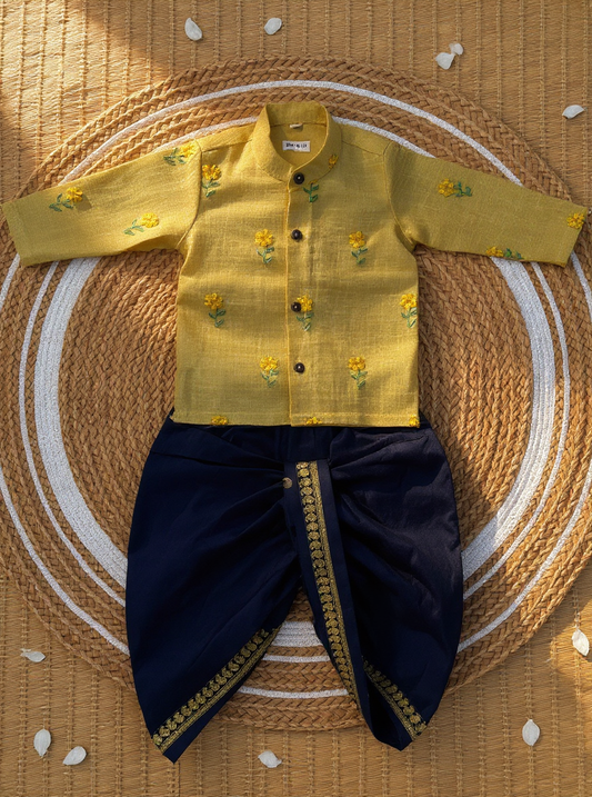 Pure Linen Pastel yellow with dark blue Kurta Dhoti Ethnic Wear for baby boy