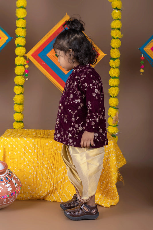 Deep Wine Velvet and Gold Dhoti Kurta for Boys and Baby Boys