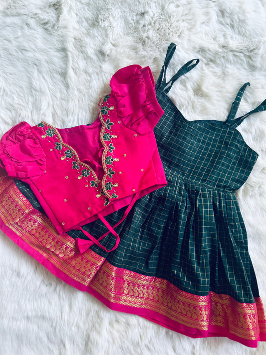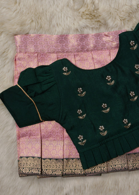 Deep green and onion pink hand work embroidery langa blouse / pattu pavadai / lehenga ethnic wear for baby girl (Small border)