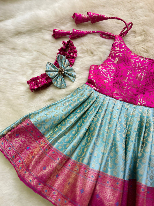 Amala - Peacock green with pink pattu silk ethnic wear for baby girl