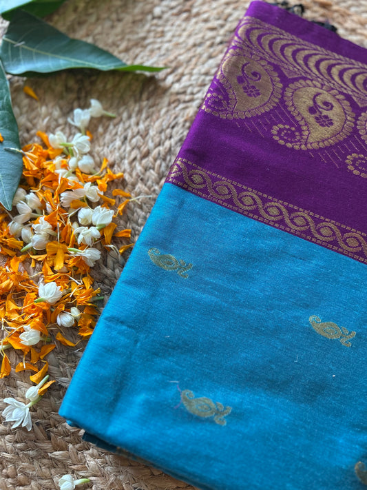 Aqua blue and wine - Premium Cotton Silk Saree with Contrast Blouse