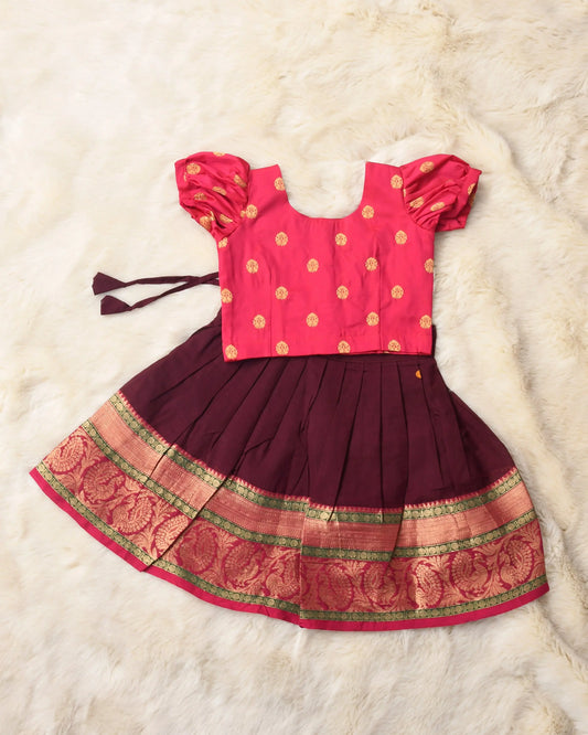 Anumati - Chocolate brown and Cherry pink traditional langa blouse kamadenu cow embroidered zari border ethnic wear pattu pavadai silk for baby girl