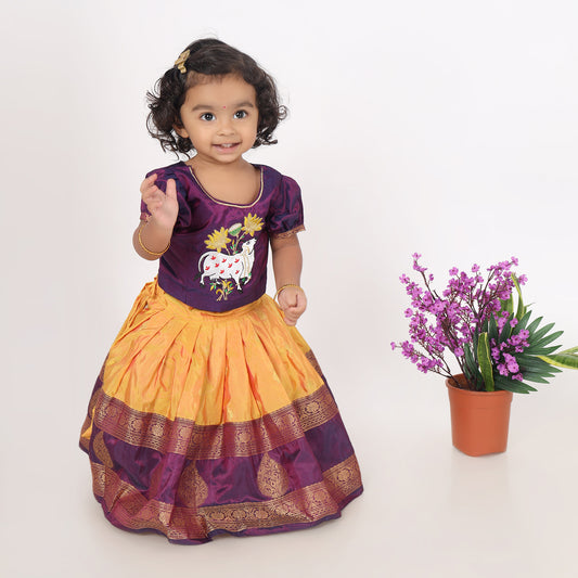 Anwita - dark violet and mustard yellow traditional langa blouse kamadenu cow embroidered zari border ethnic wear pattu pavadai silk for baby girl (Big border)