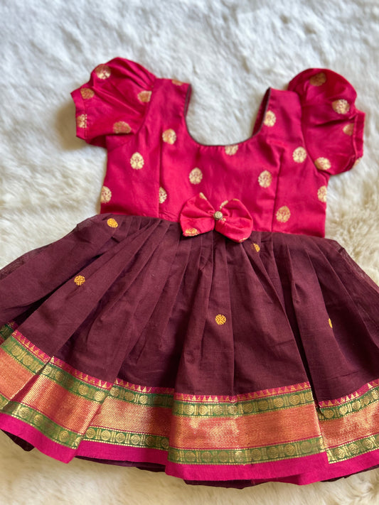 Kanchi Pink with Brown (Bow) - Kanchi Cotton South Indian Ethnic Frock for Baby Girl