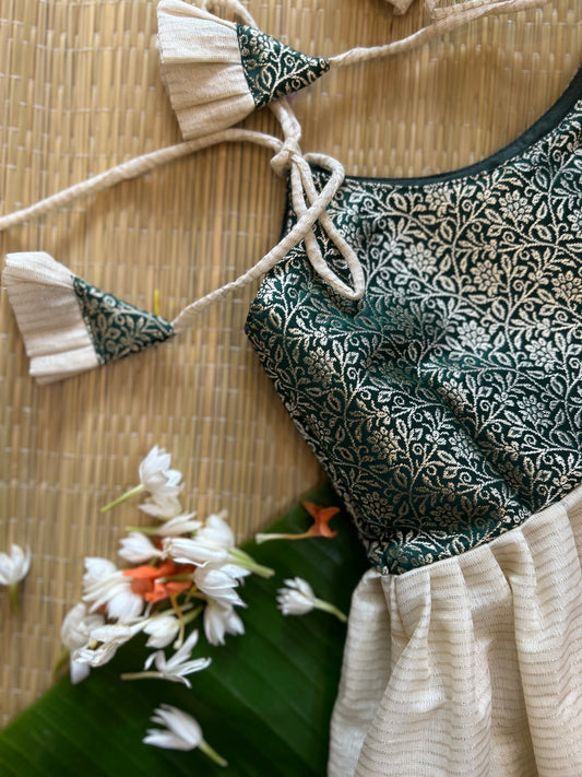 Kerala Special - Bottle green with milk white frock for festivals with head bow, shoes and undie