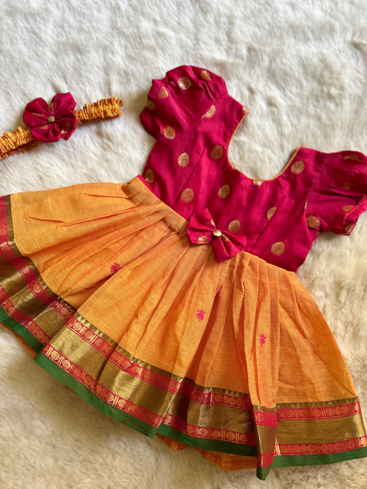 Kanchi Pink with Turmeric Yellow(Bow)- Kanchi Cotton South Indian Ethnic Frock for Baby Girl