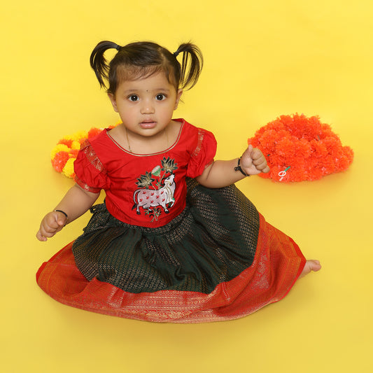 Maa Tarini - Candy Red and Forest Green traditional langa blouse kamadenu cow embroidered zari border ethnic wear pattu pavadai silk for baby girl