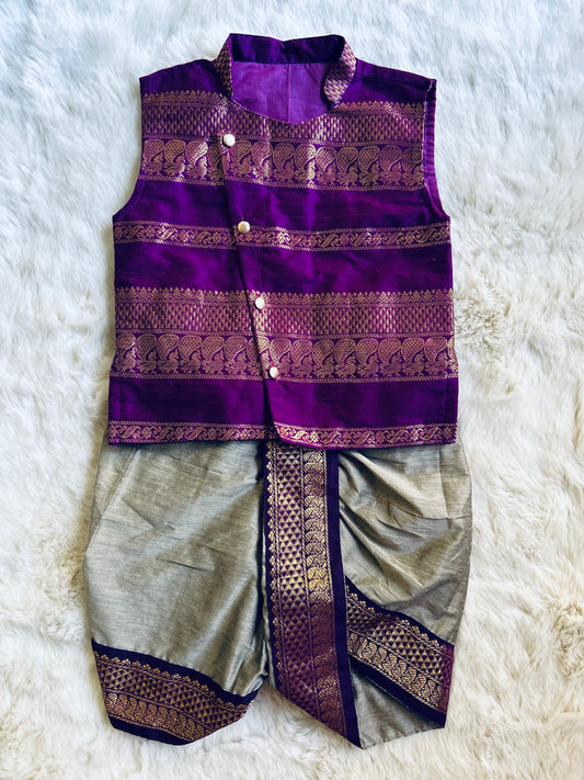 Luxury zari work sleeveless Silk kurta with grey dhoti ethnic wear for baby boy