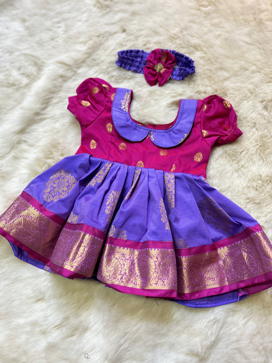 Magenta Pink and Lavender (Vintage Collar Type contrast) - Silk Ethnic Wear for Baby Girl