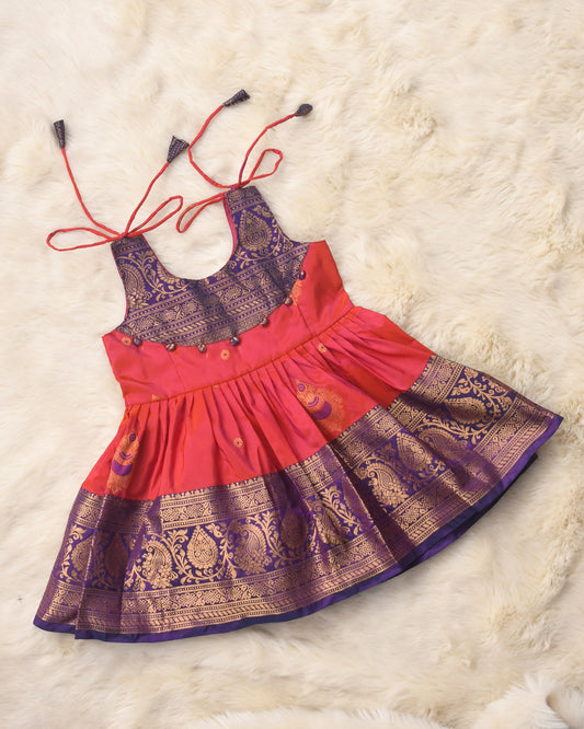 Madra - Orange with purple pattu silk ethnic wear for baby girl