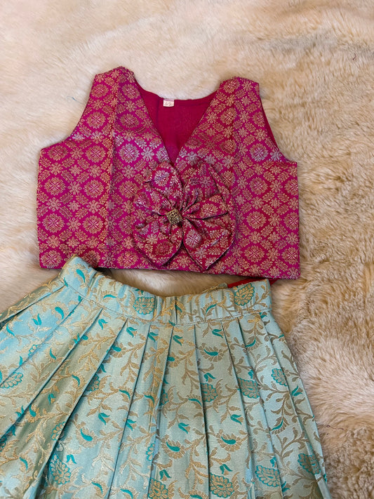 Magenta and ananda blue silk south indian ethnic wear langa blouse for baby girl