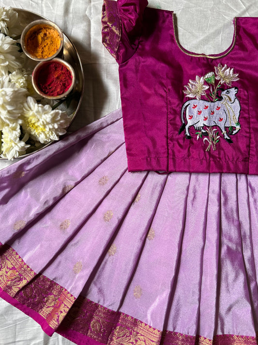 Mahadevi - Strawberry pink and Steel Grey traditional langa blouse kamadenu cow embroidered zari border ethnic wear pattu pavadai silk for baby girl