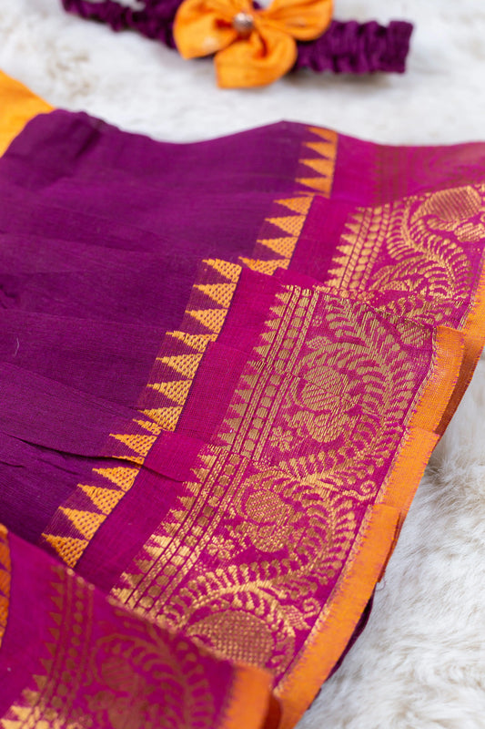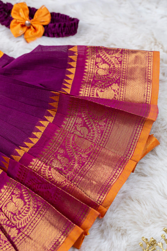 Mahavidya - Deep purple and blush pink traditional langa blouse kamadenu cow embroidered zari border ethnic wear pattu pavadai silk for baby girl