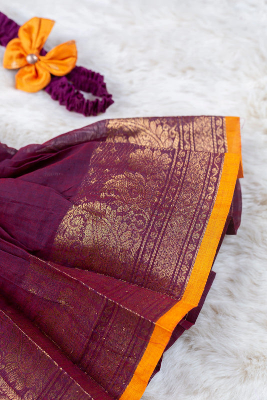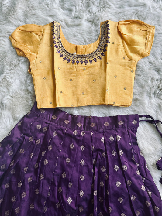 Mango yellow with wine'ish - purple silk south indian ethnic wear langa blouse for baby girl