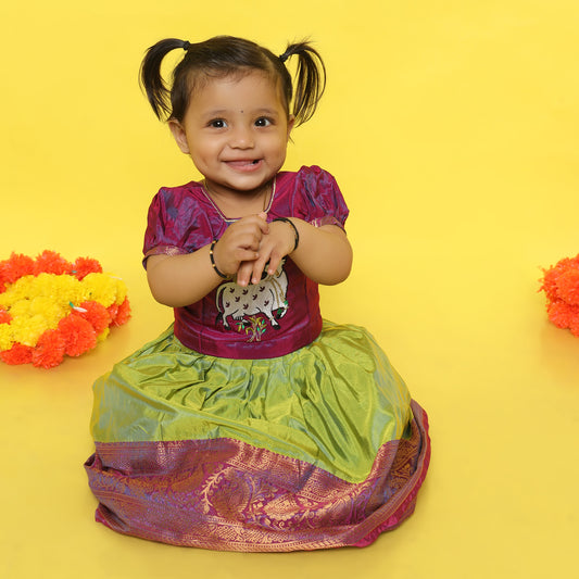 Archi - Twilight purple and Sunset pink traditional langa blouse kamadenu cow embroidered zari border ethnic wear pattu pavadai silk for baby girl