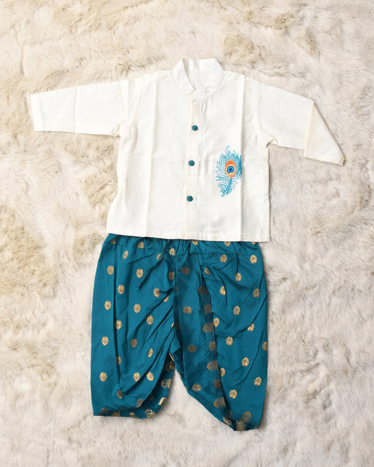 Baby Boy Krishna Dress - White and peacock blue feather embroidered kurta dhoti ethnic dress for baby boy