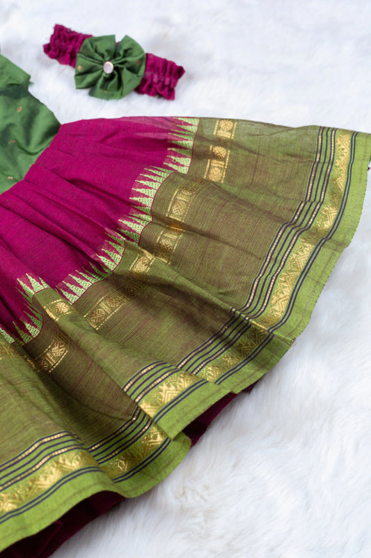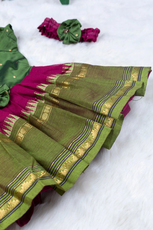 Mehendi Green with Wine (Vintage Bow) - Kanchi Cotton Silk South Indian Ethnic Frock for Baby Girl