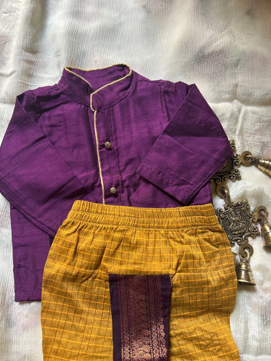 Mustard chequered and wine kurta dhoti ethnic dress for baby boy