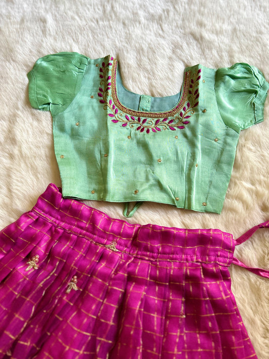 Mishka - pink and uniform green big border kanchi cotton South Indian ethnic wear langa blouse for baby girl
