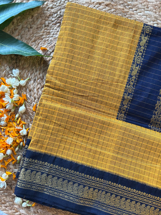 Mustard yellow and navy blue border - Premium Checked Cotton Silk Saree with Contrast Blouse