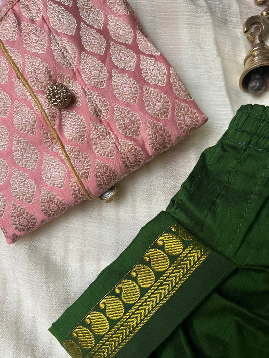 Baby Pink Banarasi Silk Baby Boy Kurta Green Dhoti Set