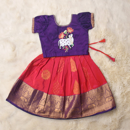 Bagalamukhi - Purple and lily pink traditional langa blouse kamadenu cow embroidered zari border ethnic wear pattu pavadai silk for baby girl