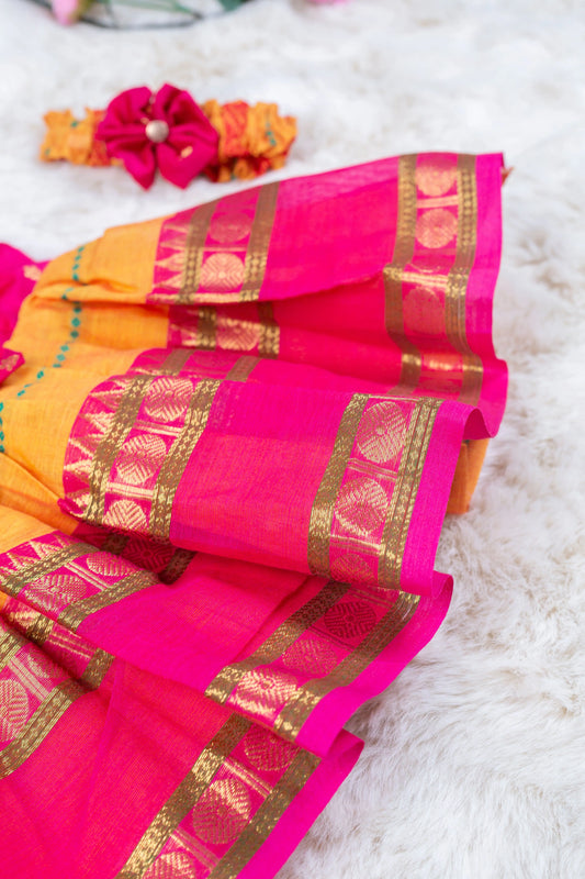 Beautiful Yellow and pink (Vintage Collar) - Kanchi Cotton Silk South Indian Ethnic Frock for Baby Girl