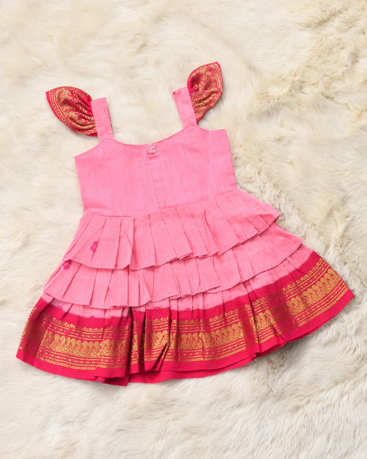 Baby pink with festive pink - Cotton Silk 3 Layered South Indian Ethnic Frock for Baby Girl