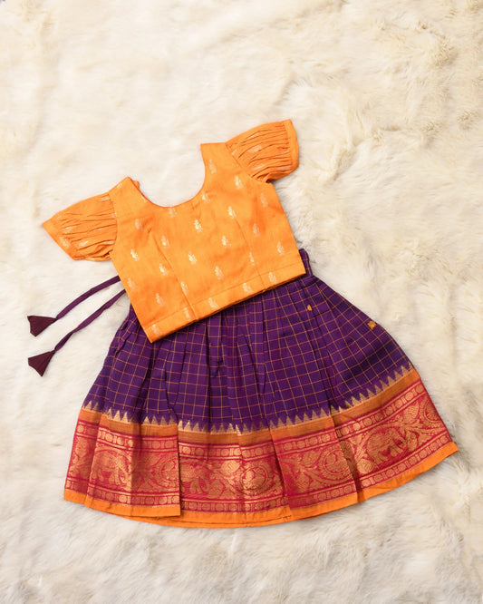 Bhuddhi - Golden yellow and purple kanchi cotton south indian ethnic wear langa blouse for baby girl