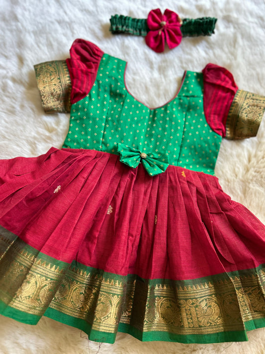 Red with Green Buff Sleeves - Kanchi Cotton South Indian Ethnic Frock for Baby Girl