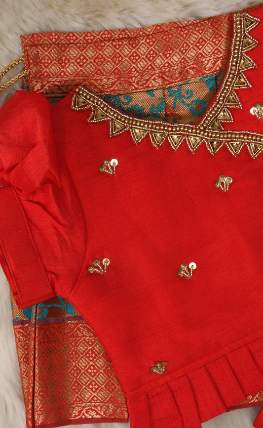 Red with multicolor hand work embroidery langa blouse / pattu pavadai / lehenga ethnic wear for baby girl