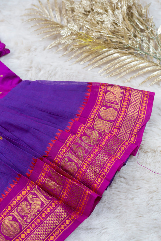 Revati - Grape purple and kamala pink traditional langa blouse kamadenu cow embroidered zari border ethnic wear pattu pavadai silk for baby girl