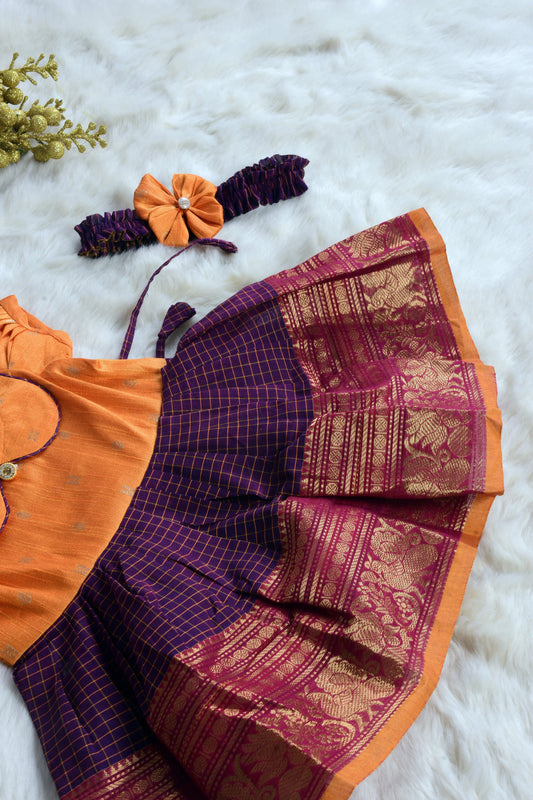 Saffron orange with wine - Cotton Silk 3 Layered South Indian Ethnic Frock for Baby Girl