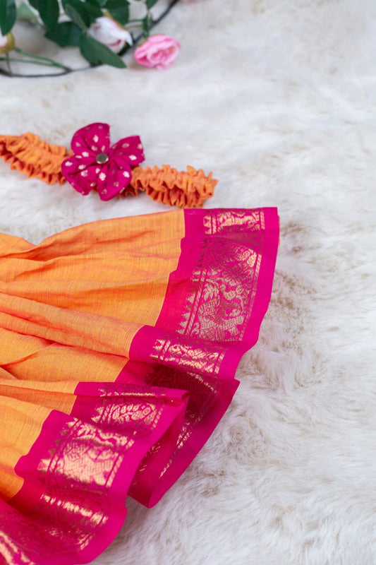 Saffron orange with pink (Vintage Bow) - Kanchi Cotton Silk South Indian Ethnic Frock for Baby Girl