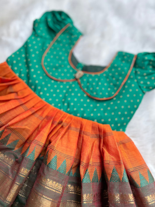 Saadhavi - Orange with bottle green pattu silk ethnic wear for baby girl