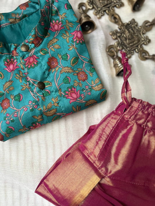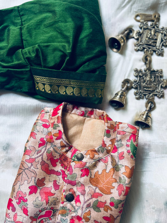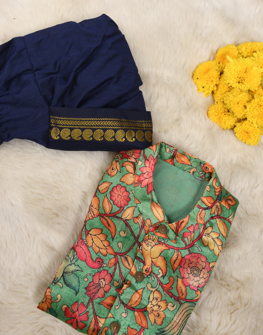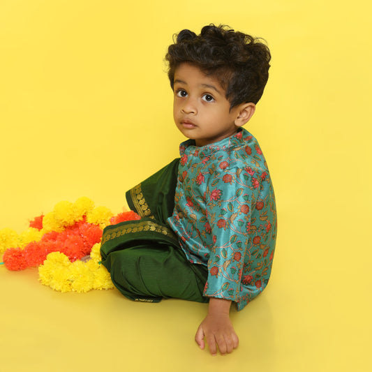 Traditional Indian Kalamkari Neeli Baby Boy Silk Kurta Green Dhoti Set