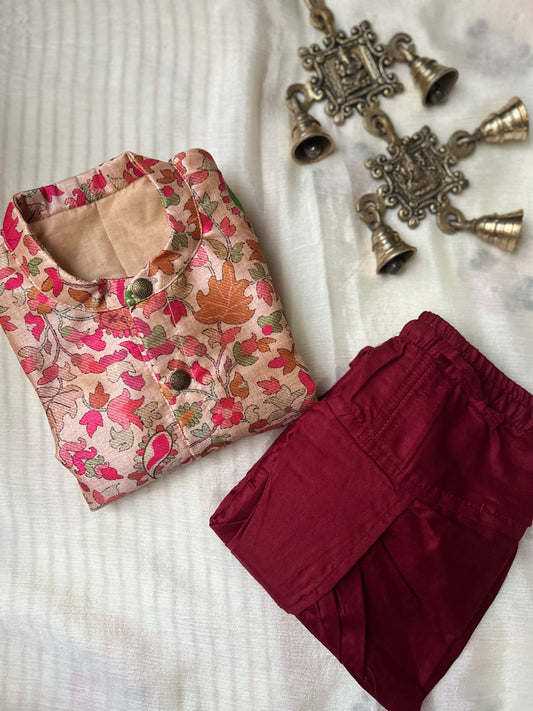 Traditional Indian Kalamkari Soft Beige Baby Boy Silk Kurta Maroon Dhoti Set
