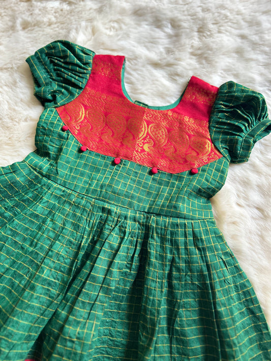 Traditional green with red zari border kalyani cotton silk dress for baby girl