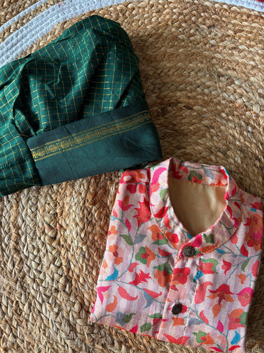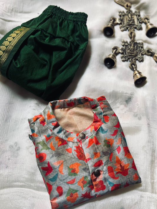 Traditional Indian Multi floral Baby Boy Silk Kurta Green Dhoti Set