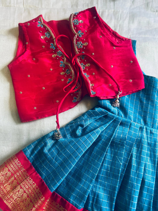 Traditional red and powder blue ethnic wear langa jacket for baby girl