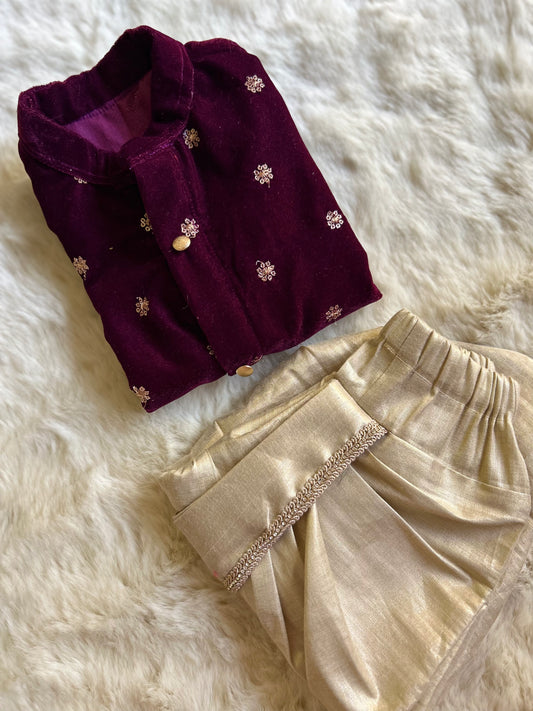 Velvet wine kurta and gold dhoti ethnic wear for baby boy