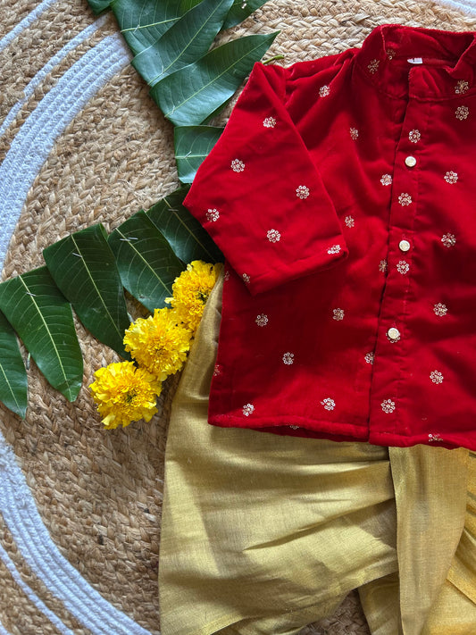 Velvet red and gold color kurta dhoti ethnic wear for baby boy