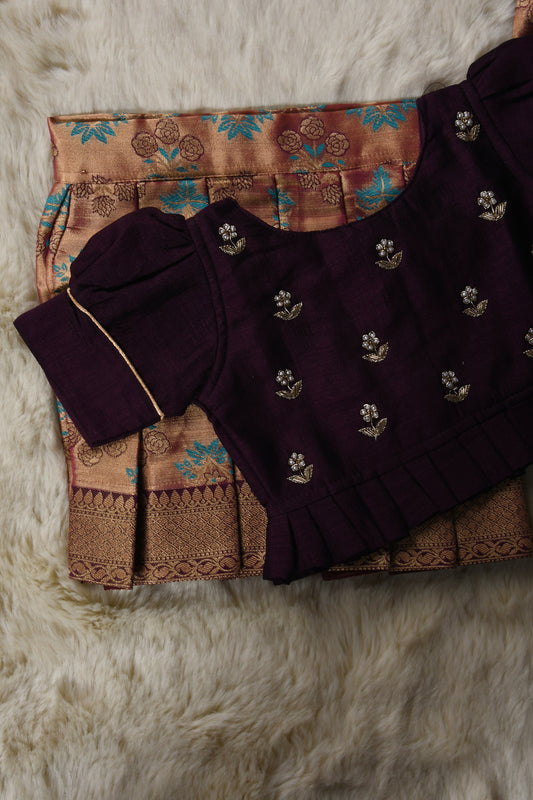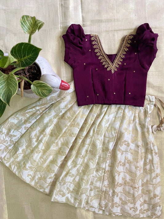 Wine and white silk south indian ethnic wear langa blouse for baby girl