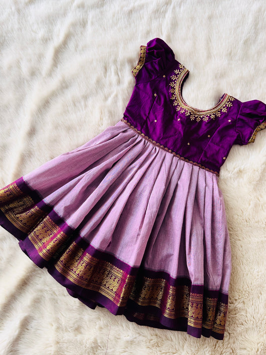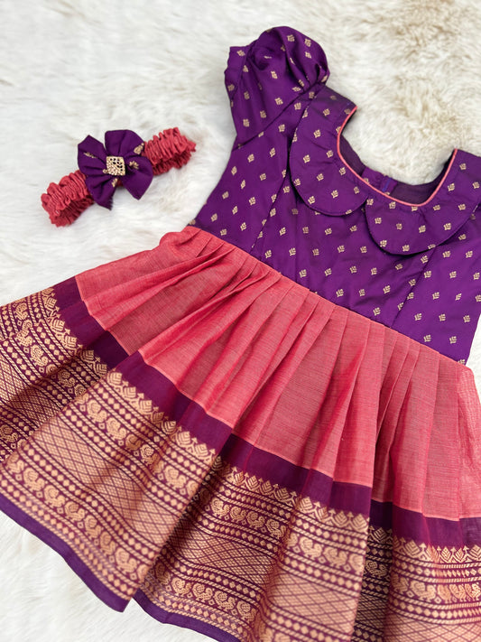 Wine with dull peach ( Big border ) - Kanchi Cotton South Indian Ethnic Frock for Baby Girl