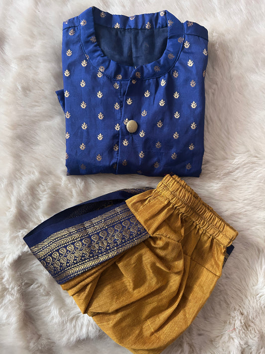 Blue with mustard yellow Cotton Silk Baby Boy Kurta Dhoti Set