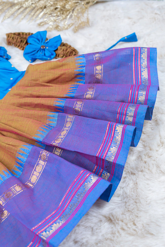 Blue with mustard ( Big border ) - Kanchi Cotton South Indian Ethnic Frock for Baby Girl