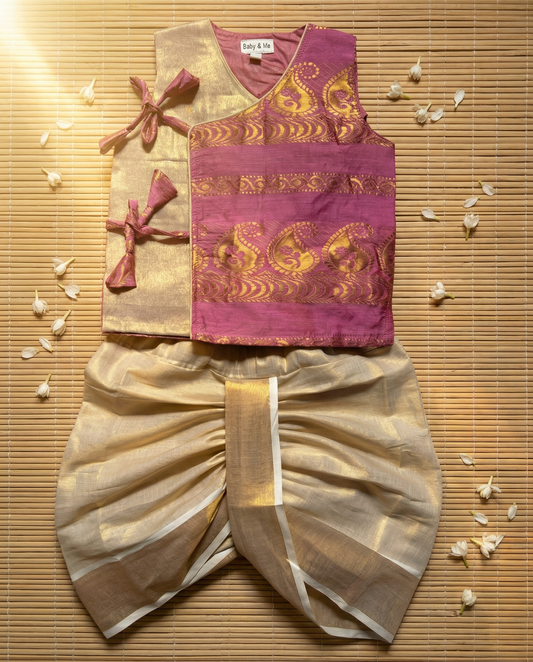 Onion pink Angrakha Kurta with gold dhoti - Cotton Silk ethnic wear for baby boy