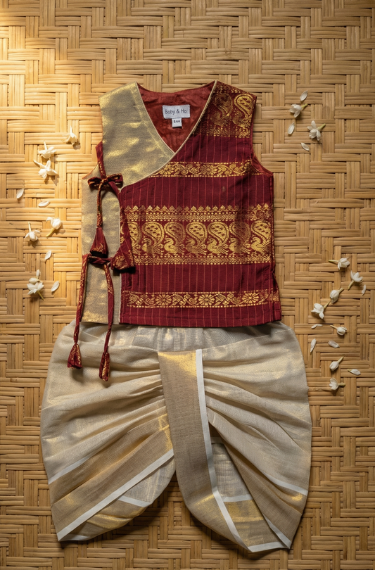 Royal Maroon Angrakha Kurta with Reshme Beige gold dhoti - Cotton Silk ethnic wear for baby boy